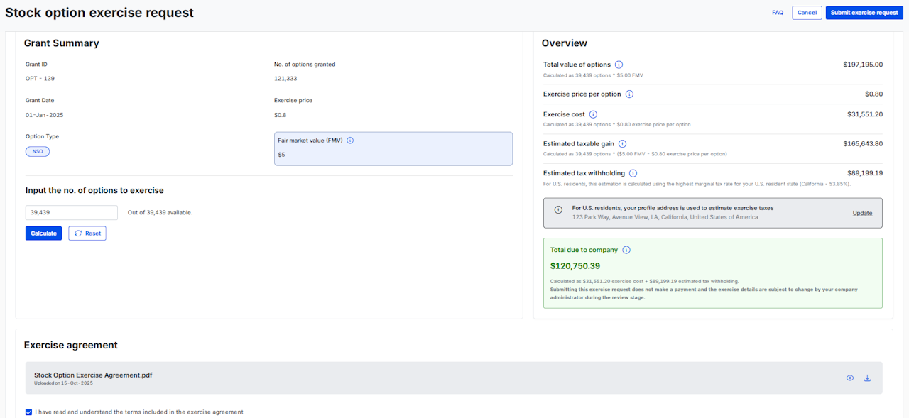 Note: If the “Exercise” button is muted or disabled, hover over it for more information. You may need to contact your company administrator if required information is missing which may prevent you from creating the request.