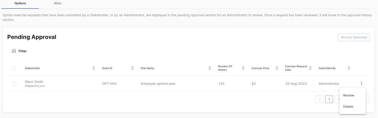 You can delete a "Pending" options or SARs exercise request on the Exercise and Releases page by clicking on the 3 dot action menu and selecting delete.