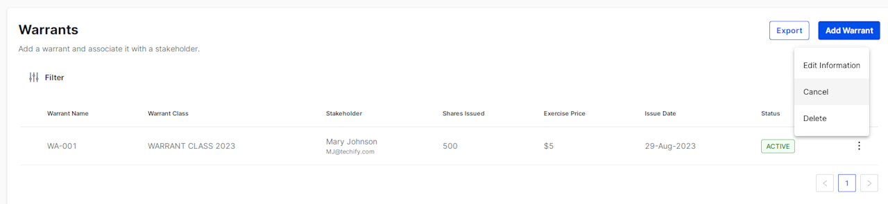 Select the 3-dot menu of the warrant record and Select 'Cancel' from the menu