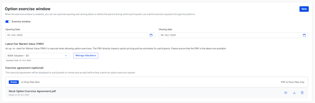 Introduces the ability to link a Fair Market Value (FMV) to plans with an open option exercise window to support exercise calculations and allows admins to optionally upload a generic exercise agreement for participants to accept.