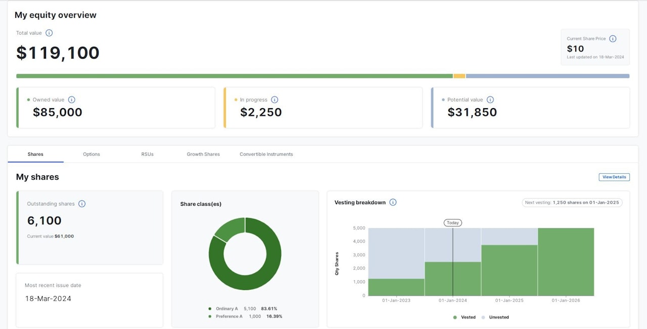 The share dashboard provides an overview of the participants outstanding shares. Outstanding shares refer to the total number of shares that you currently own in the company.